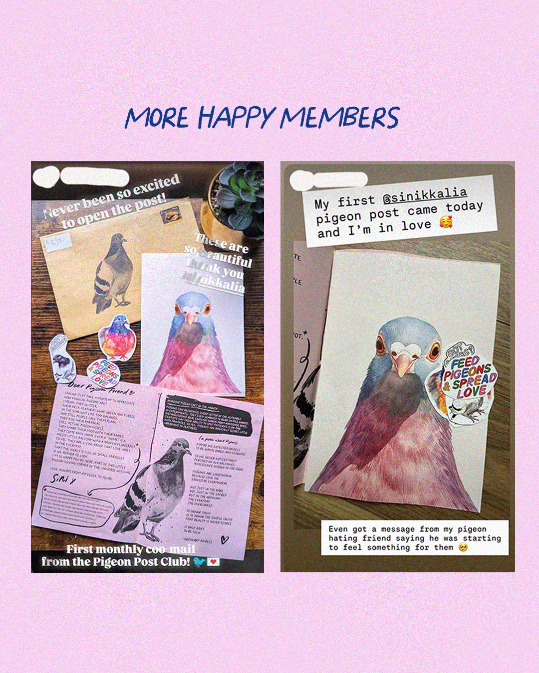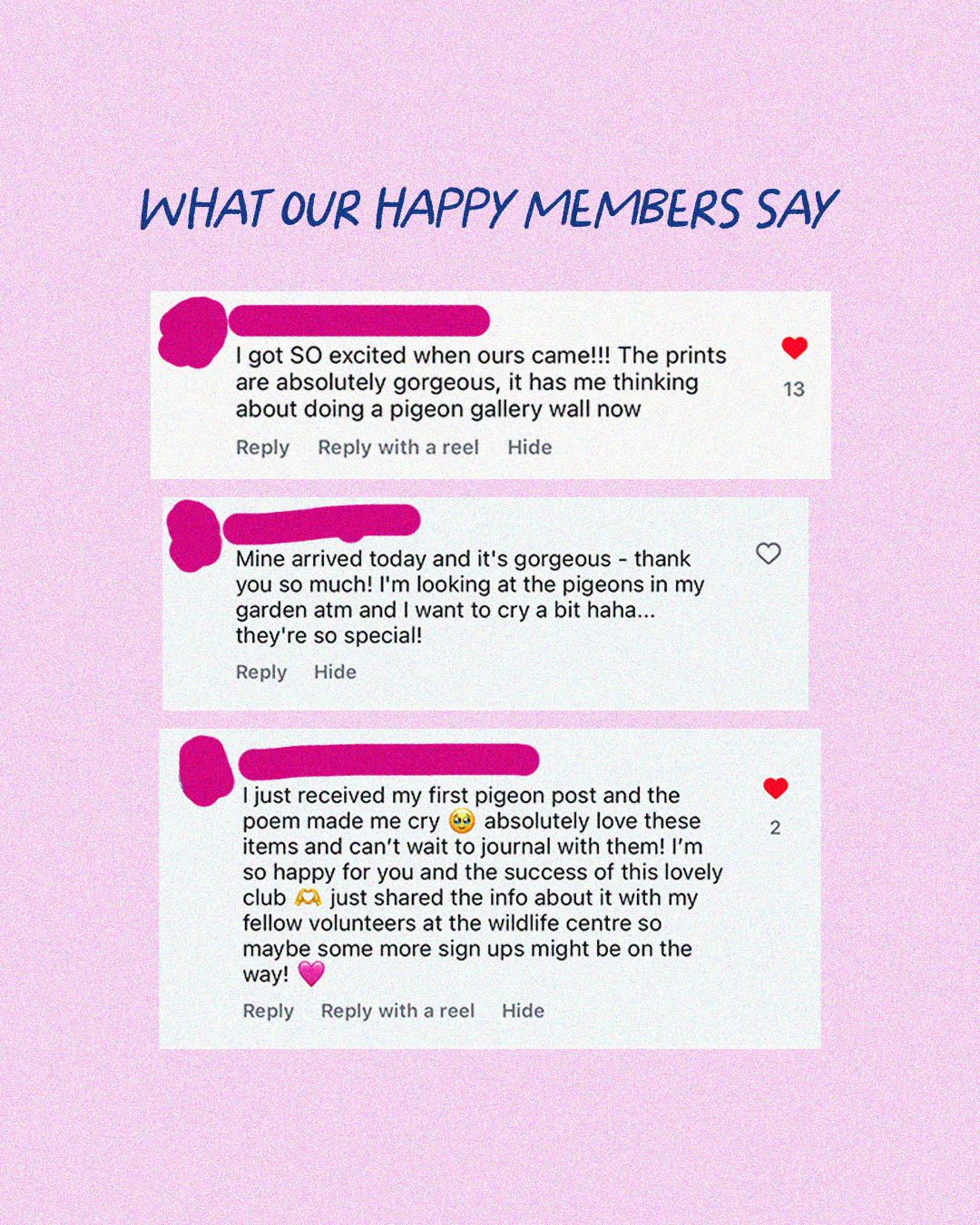 Each month, you receive one illustrated A6 art print / postcard and a written letter about pigeons — always a little poetic, always including one amazing pigeon fact. Every month has a new theme, and occasionally there’s a small surprise.