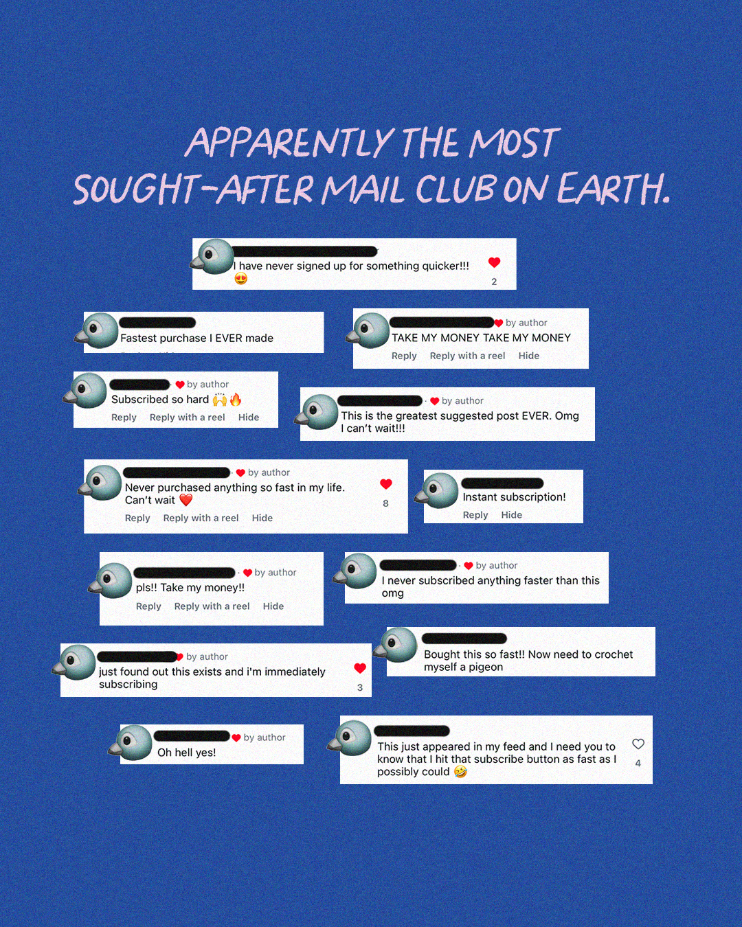 The Pigeon Post Club is amonthly pigeon-themed mail clubcreated tosupport pigeon rescue and spread pigeon awareness.